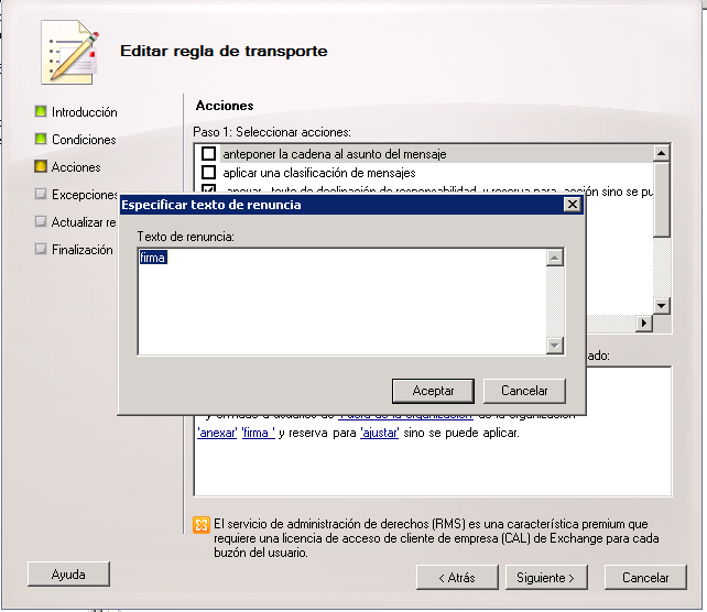 Si seleccionamos Siguiente seleccionaremos Anexar texto de declinacion de responsabilidad y reserva para acción…