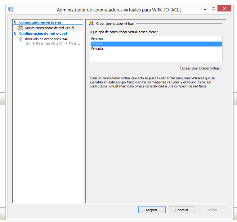 Creamos uno interno ya que vamos a compartir la conexión virtual con la de la tarjeta wifi de nuestro euqipo